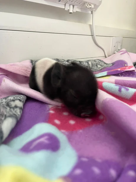 The adorable piglet, who has black and white markings like a panda is receiving goats milk and intensive care, and today she will start on lamb colostrum from the vet which will hopefully help her grow and thrive.