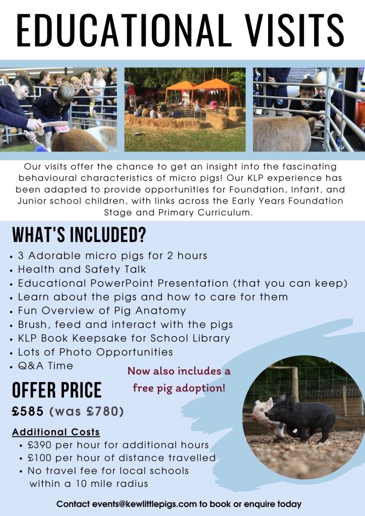 Our visits provide a unique educational opportunity to explore the intriguing behavioural traits of micro pigs and learn all about animal care! The Kew Little Pigs Farm experience has been tailored to create opportunities for schools.