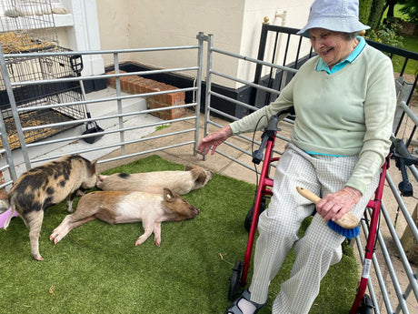 Our Thera-Pigs absolutely love visiting care homes, and residents absolutely relish spending time with and cuddling our adorable animals.
